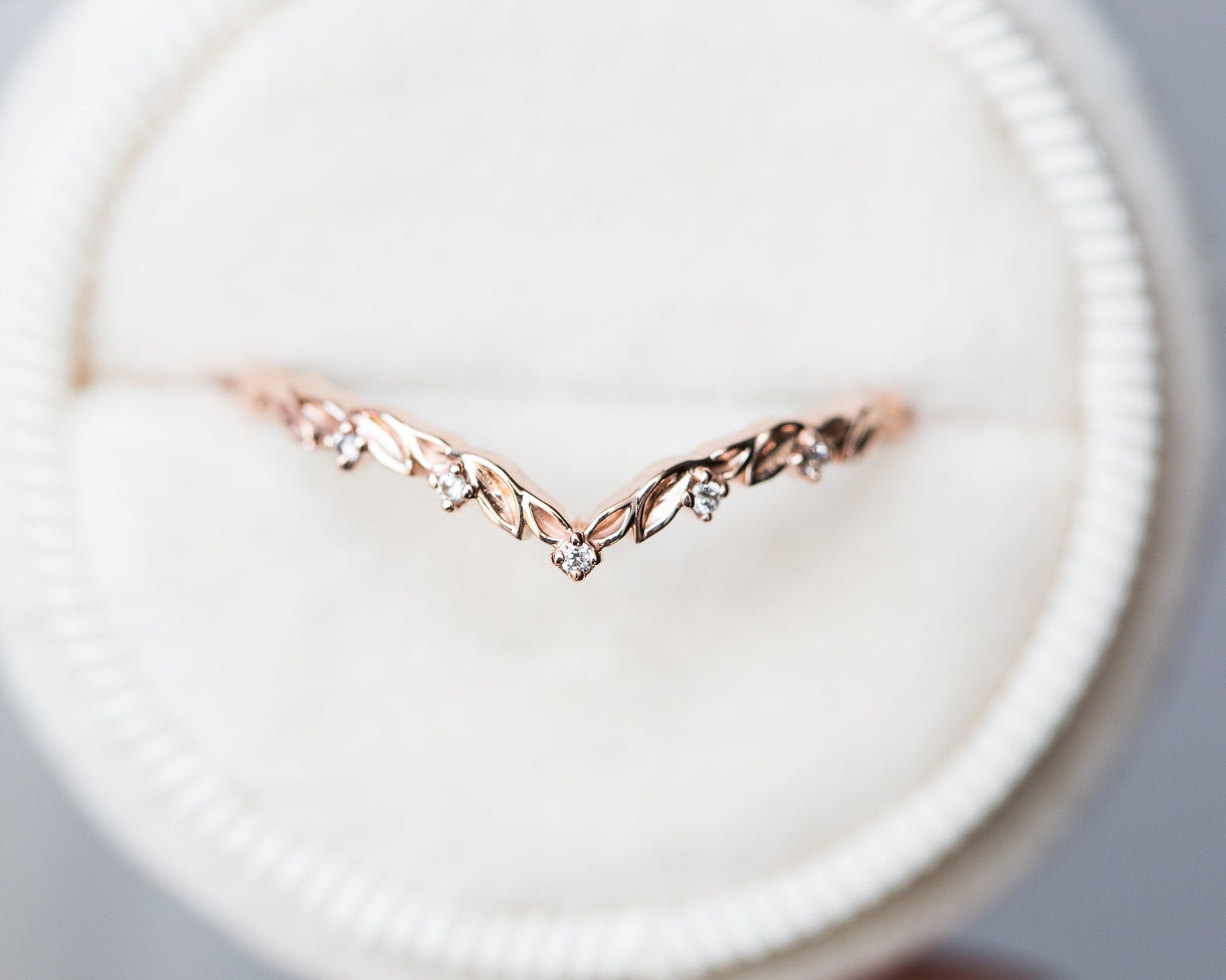 -Delicate leaves curve together into a chevron swoop, making this ring look great with rings that need a deeper curve to sit with their main ring. Also looks great on it's own or with a gap between rings.