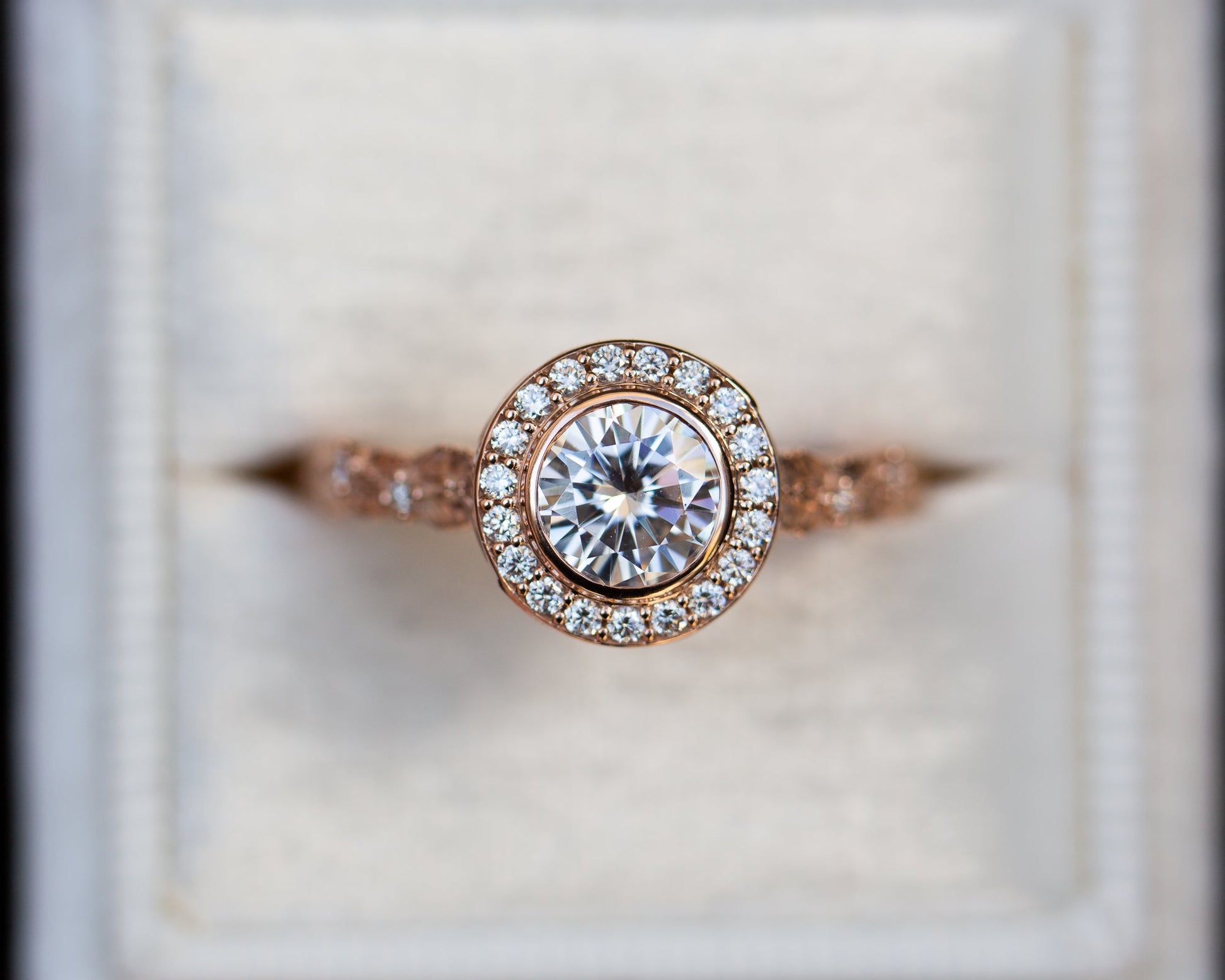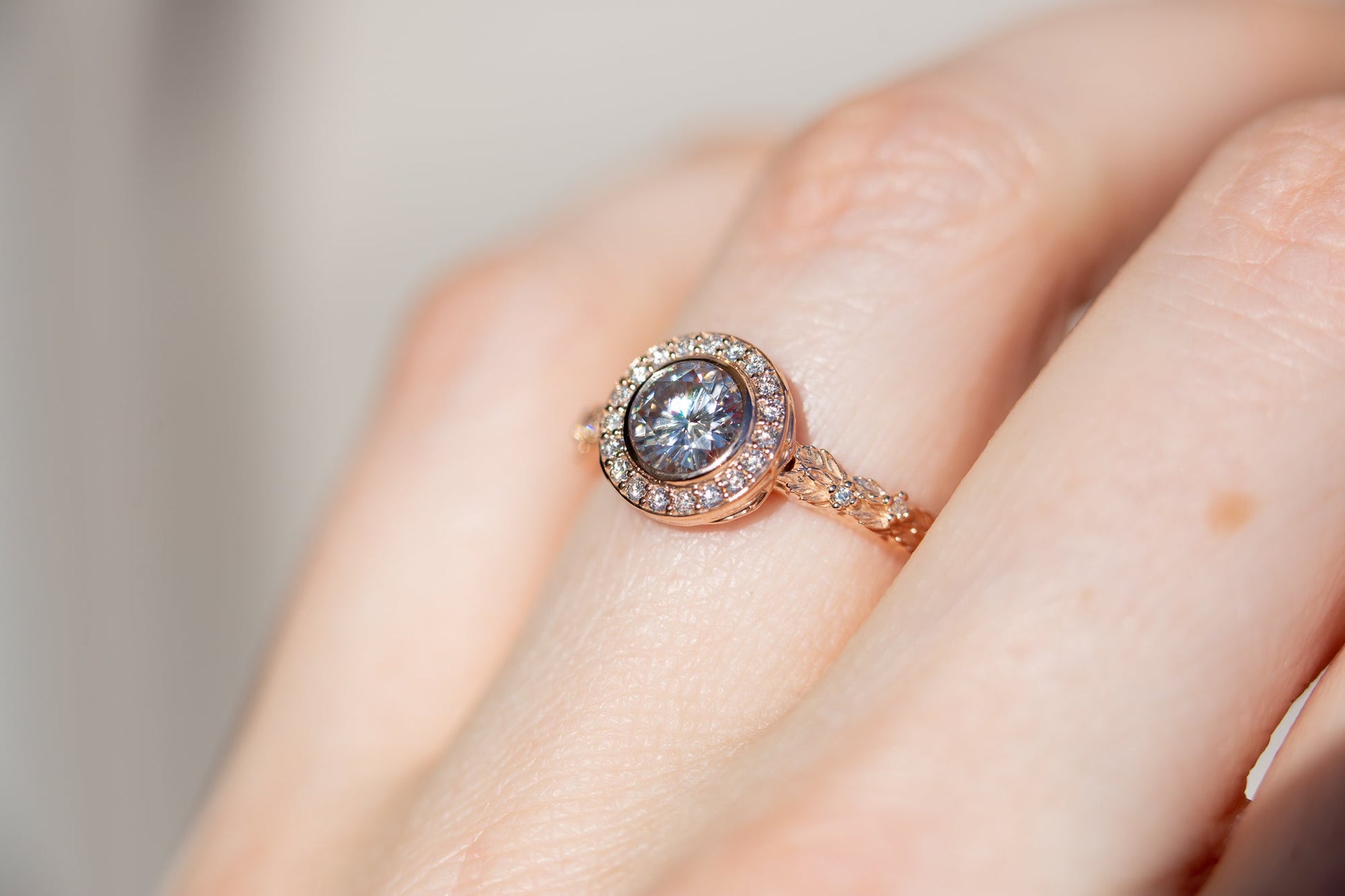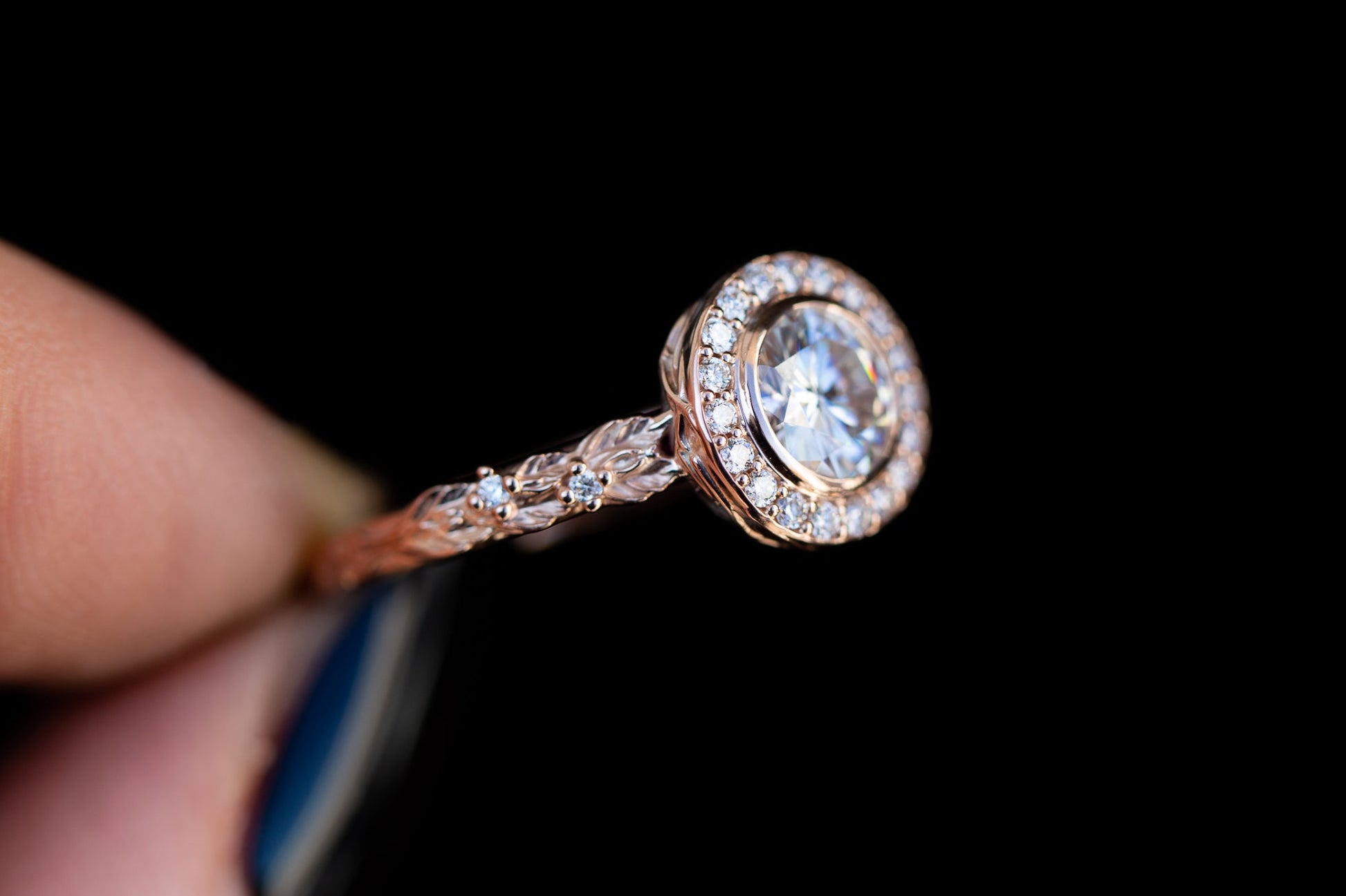 -Small leaves are woven together on each side of the ring, with small bramble type of thorns wrapping around the center stone and slightly down the sides after the leaves.