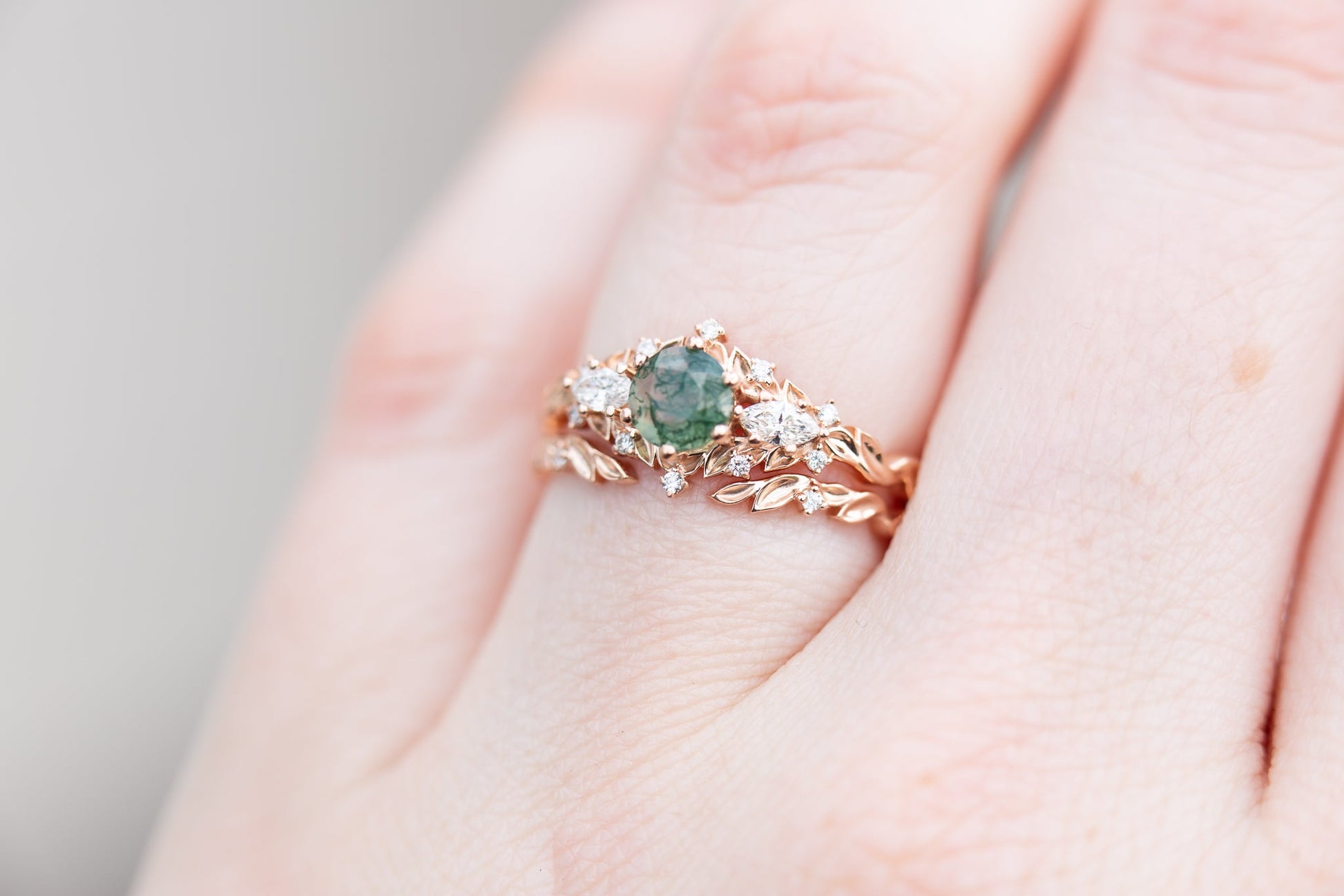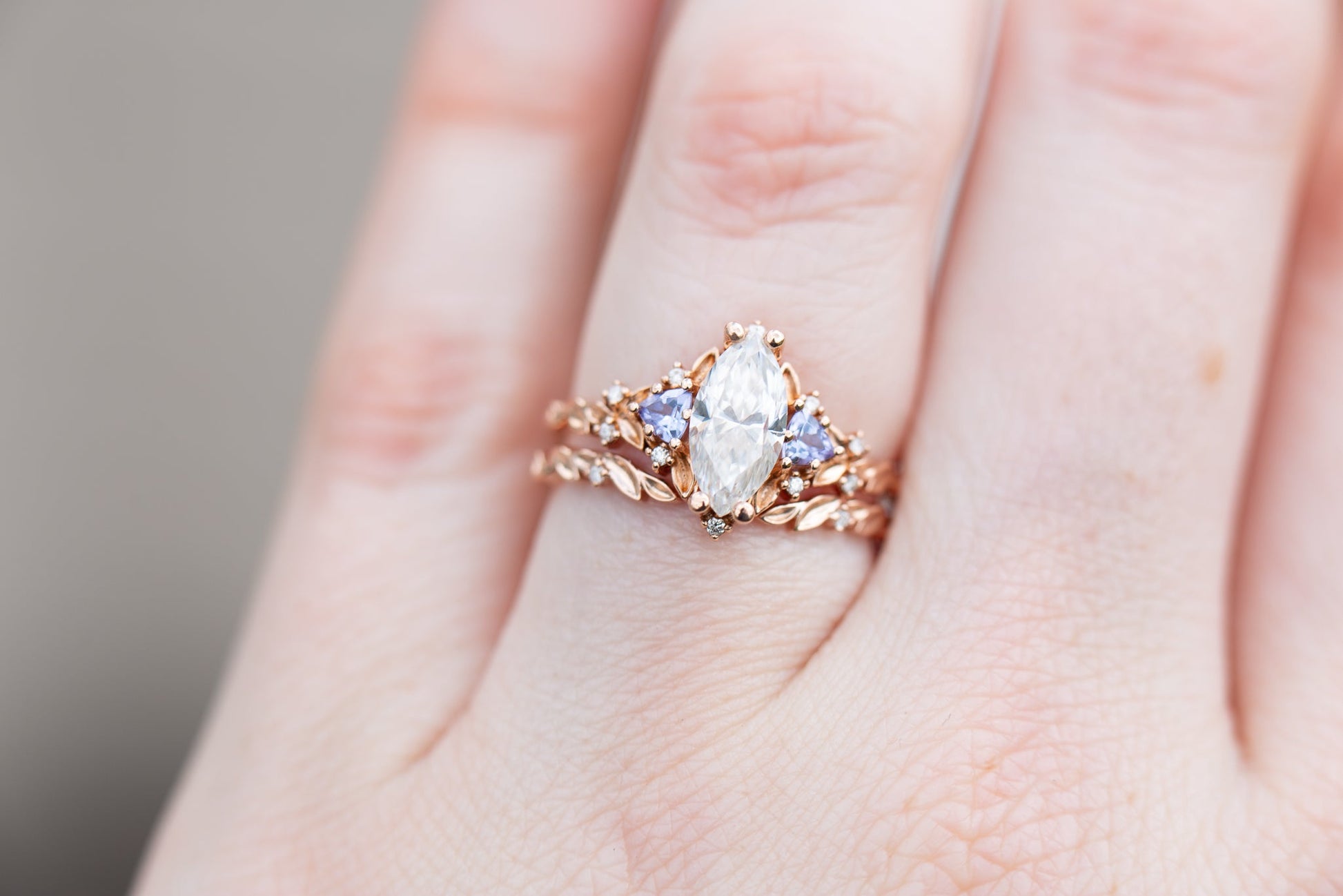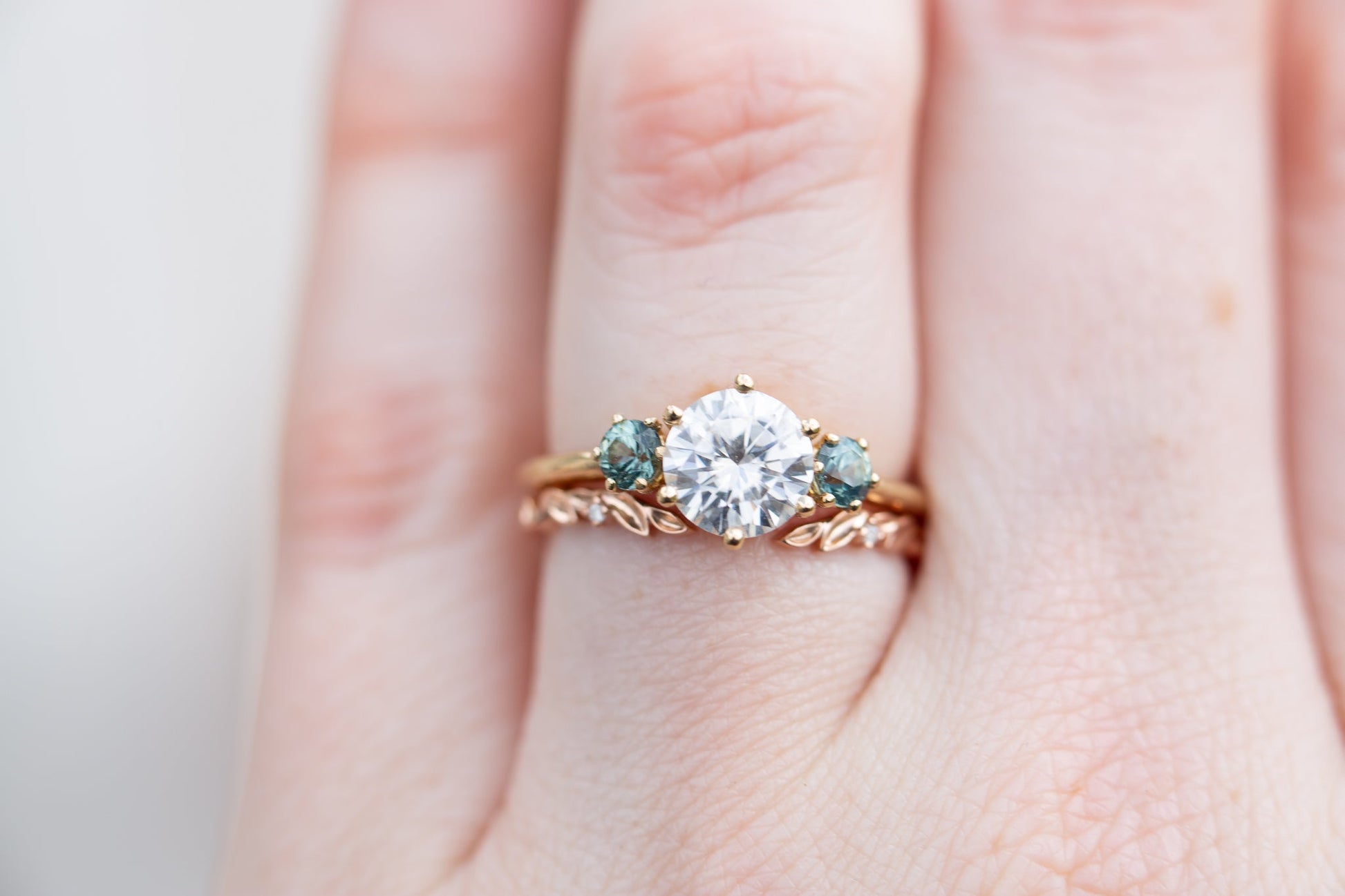 -Two 1mm white diamonds are place inside the curves of the leaves, giving this ring a little extra sparkle. Prong set.