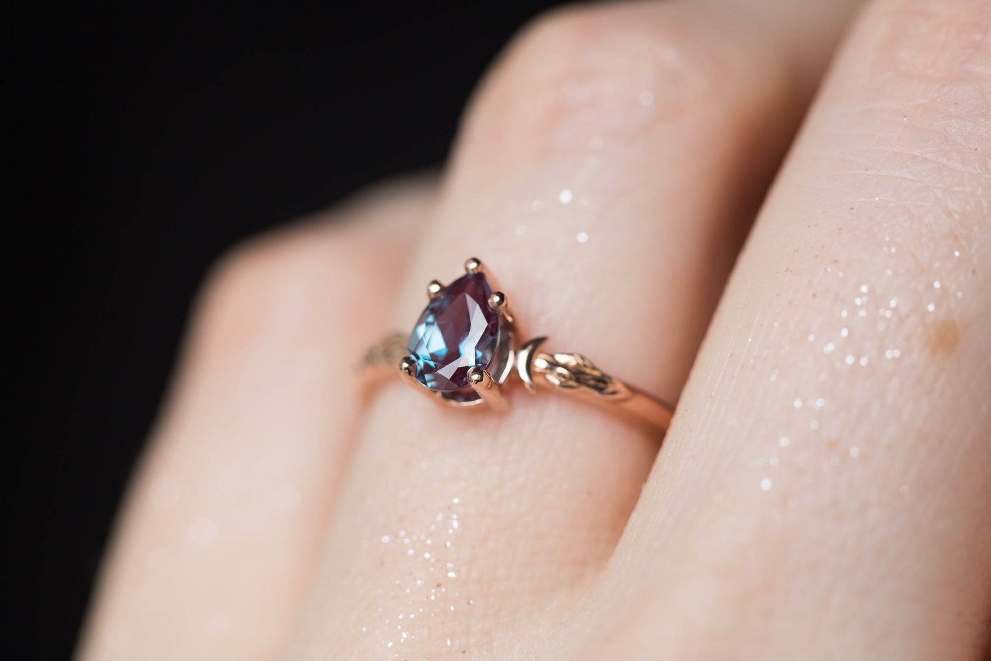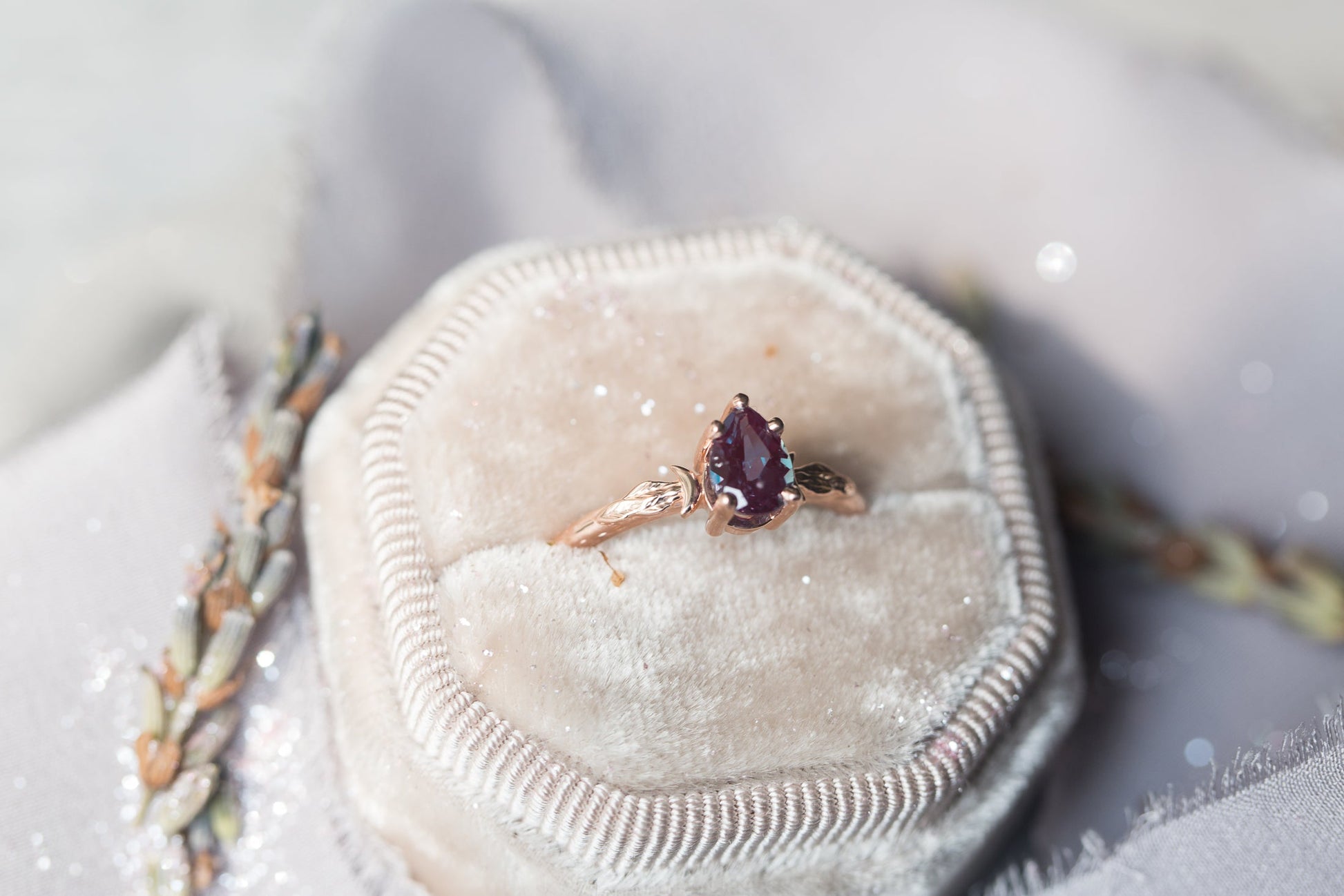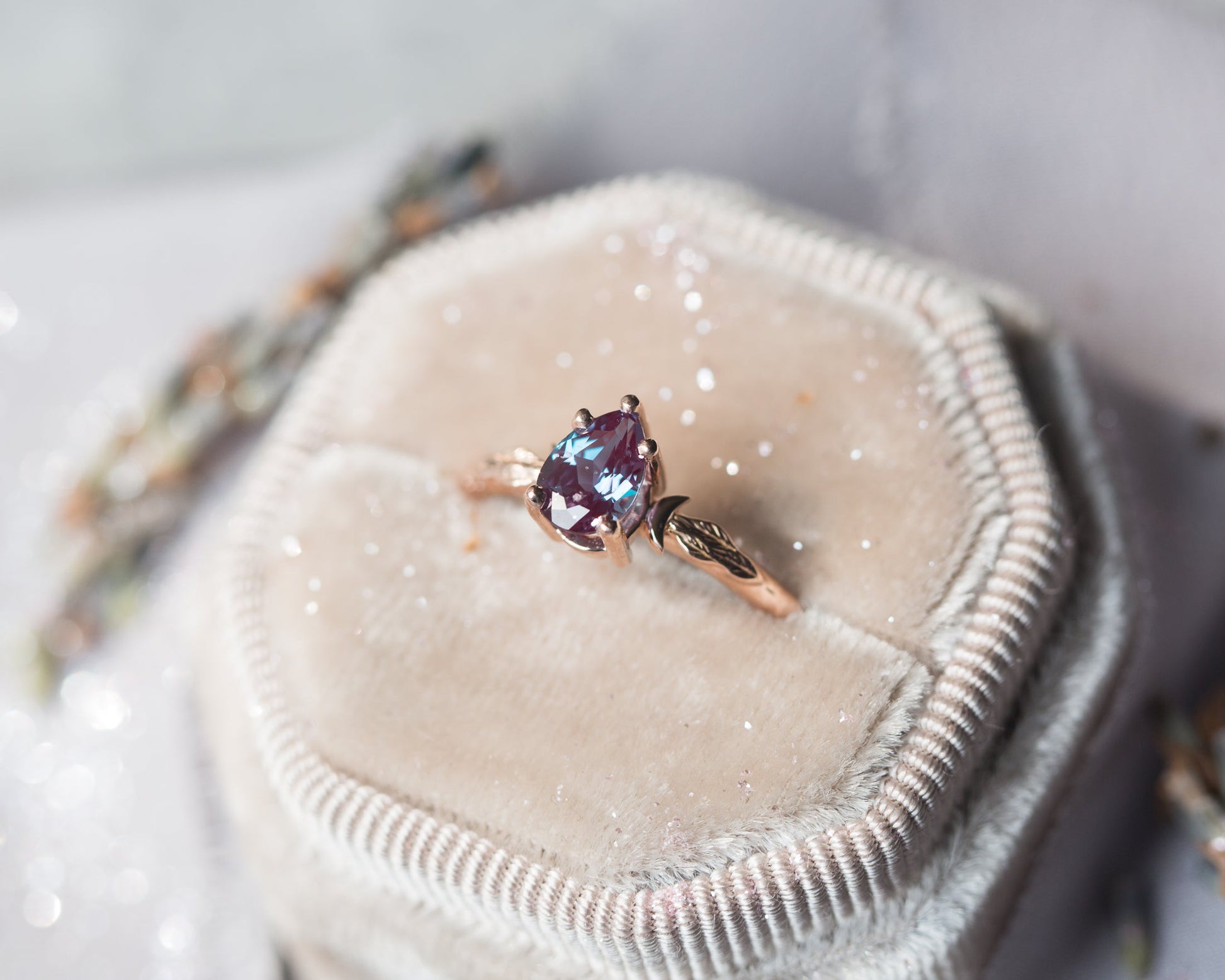 My original crescent moon leaf ring, featuring a beautiful lab alexandrite center stone.