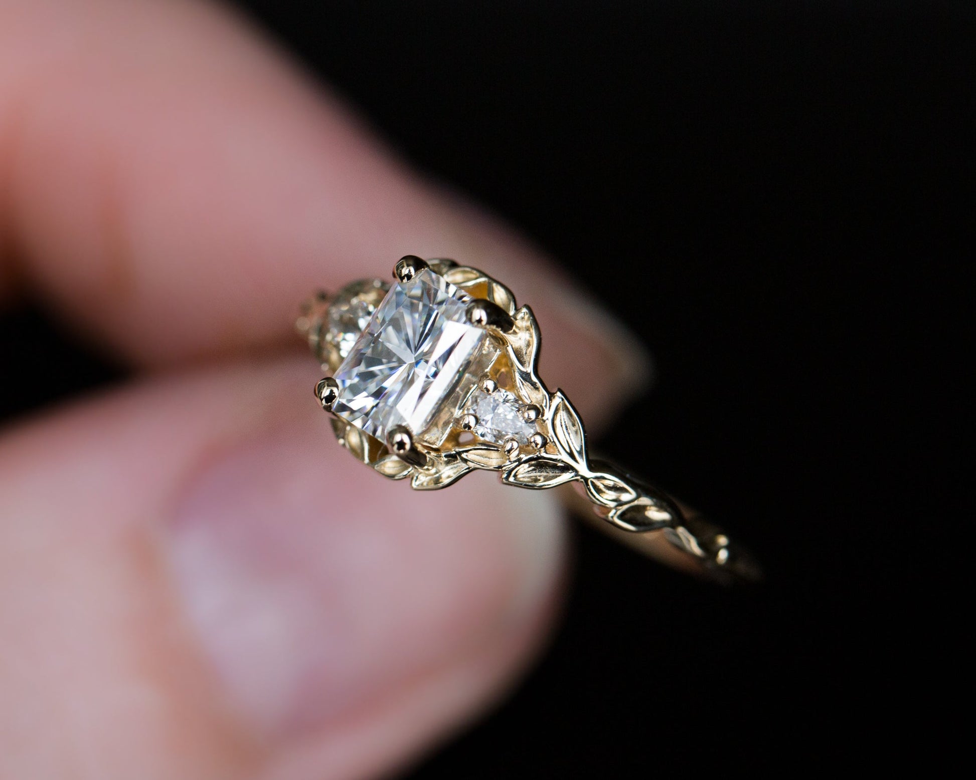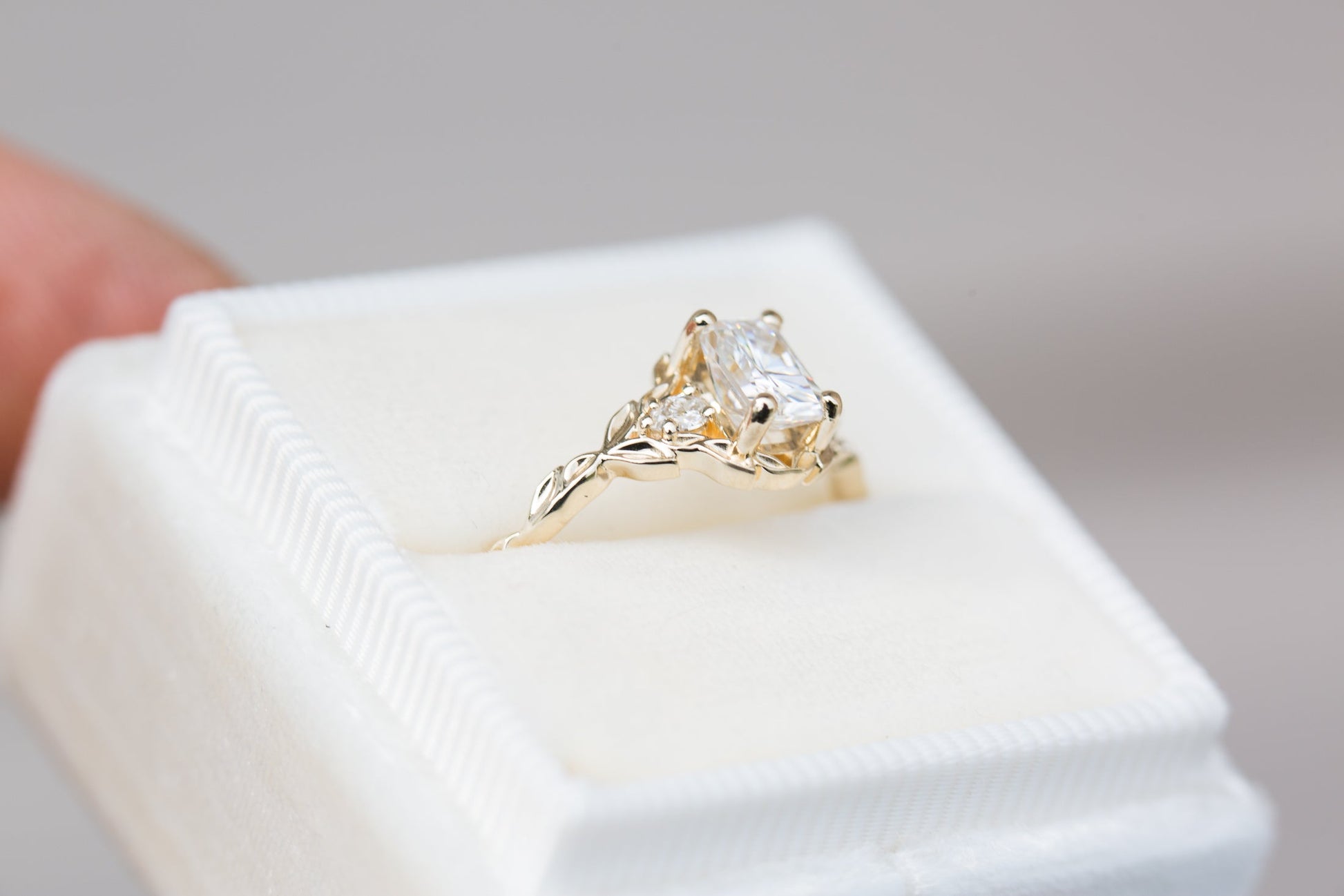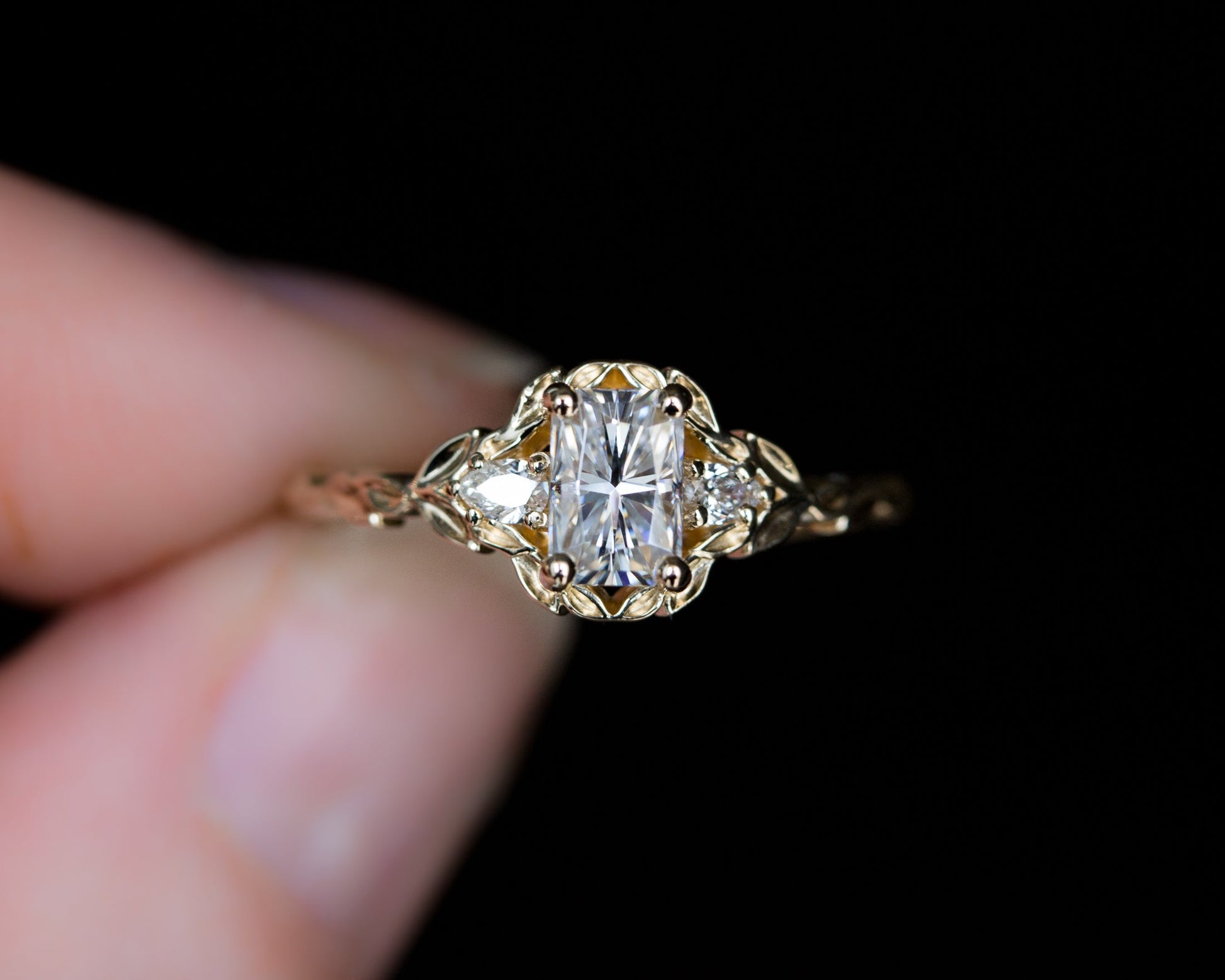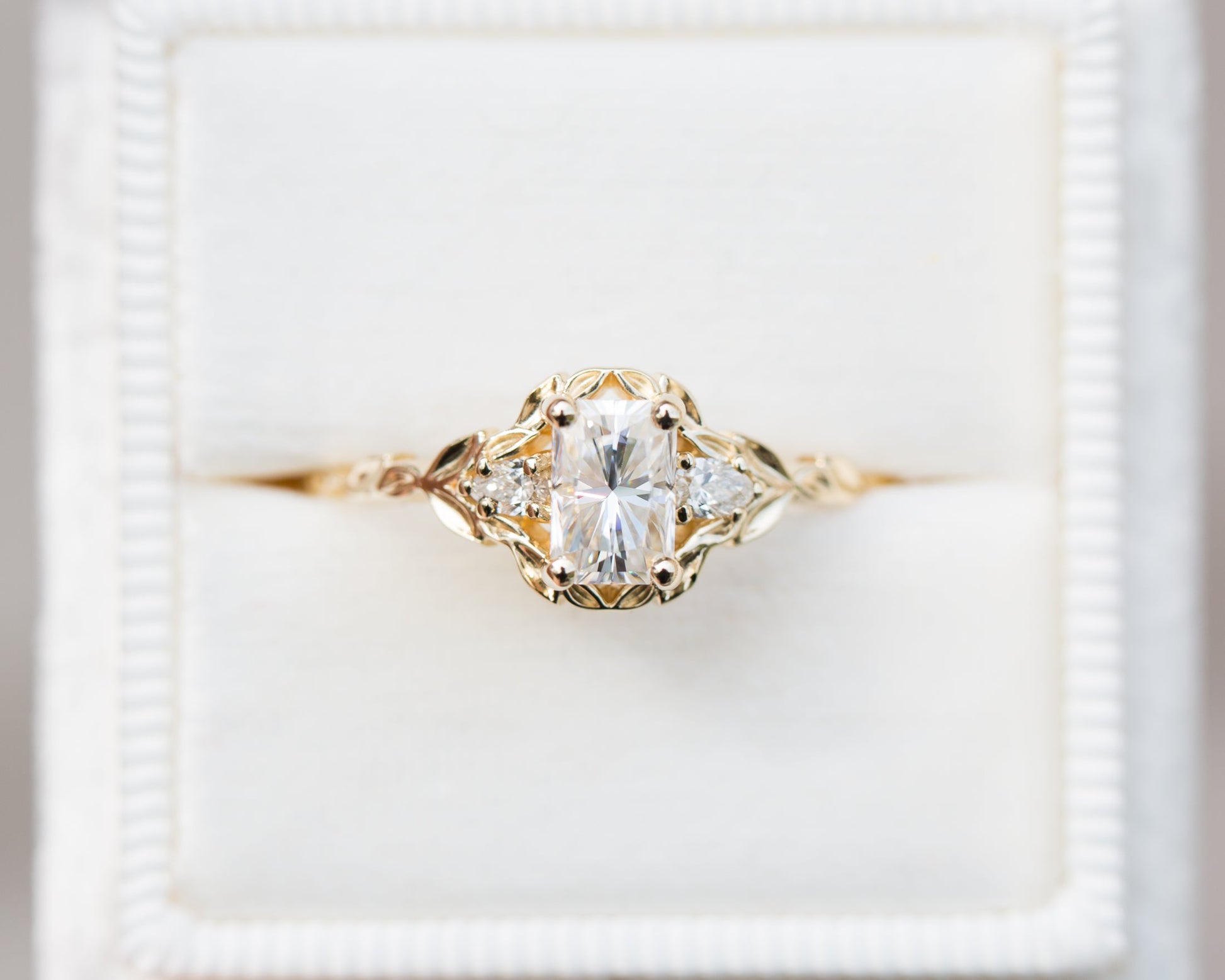 The wisteria setting, featuring a split shank leafy setting with radiant cut moissanite.